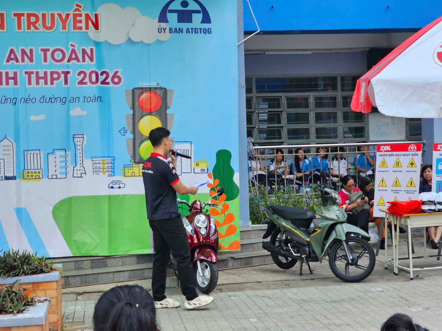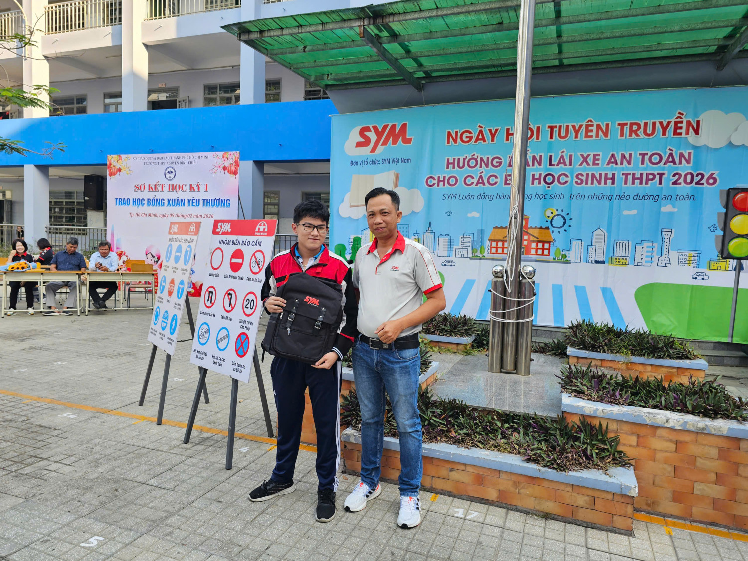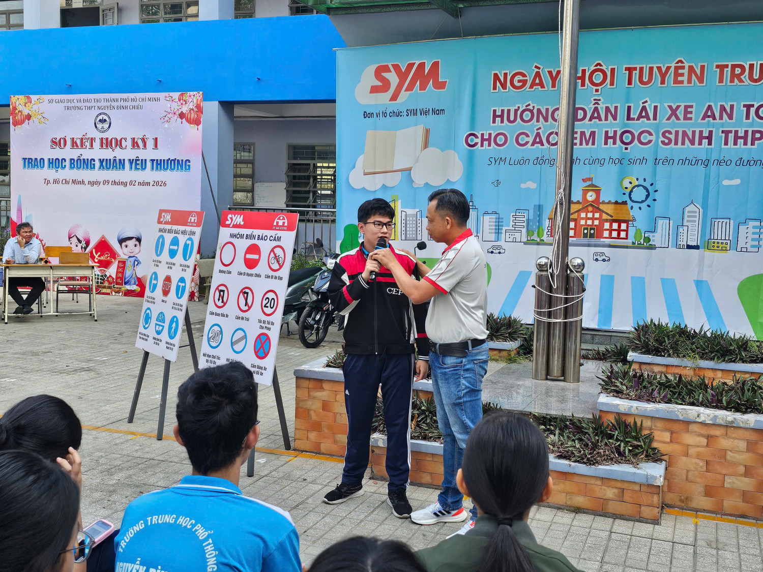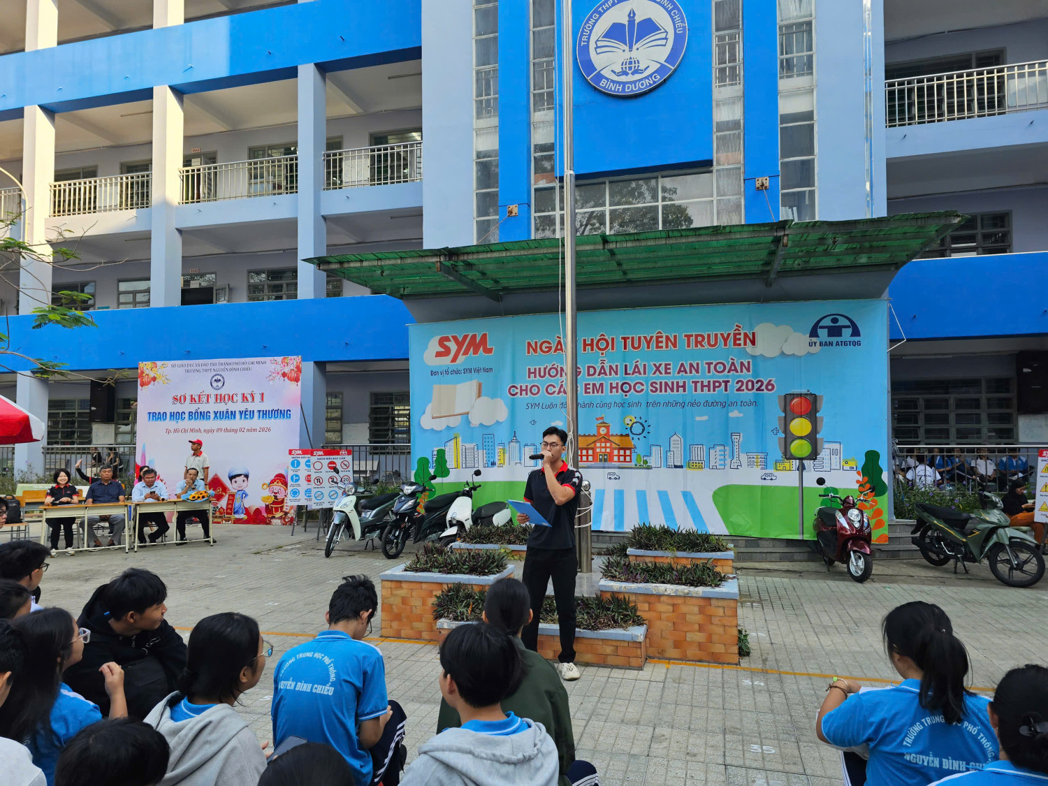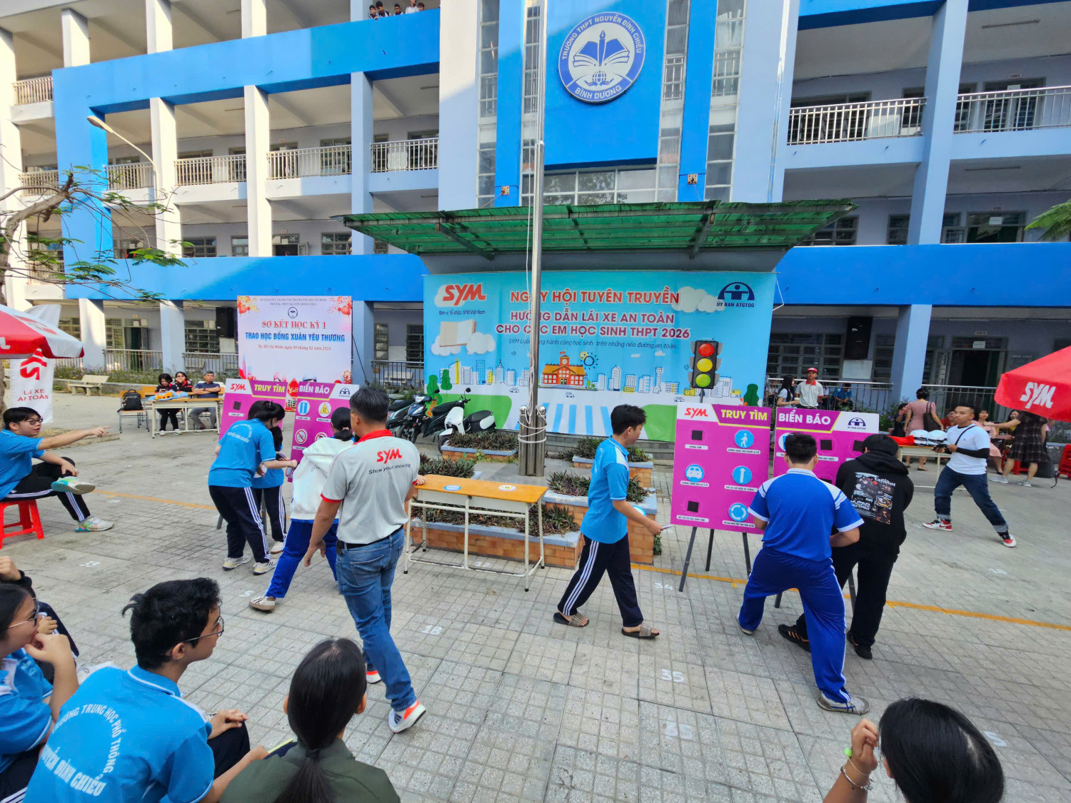 Chương trình diễn ra từ 07 giờ 00 đến 11 giờ 00 với sự tham gia của đại diện Công ty SYM Việt Nam (VMEP), Ban Giám hiệu nhà trường, quý thầy cô giáo cùng đông đảo học sinh toàn trường. Đây là hoạt động có ý nghĩa thiết thực nhằm trang bị cho học sinh những kiến thức, kỹ năng cơ bản về an toàn giao thông, đặc biệt là ý thức chấp hành pháp luật khi tham gia giao thông, góp phần xây dựng văn hóa giao thông học đường an toàn, văn minh.